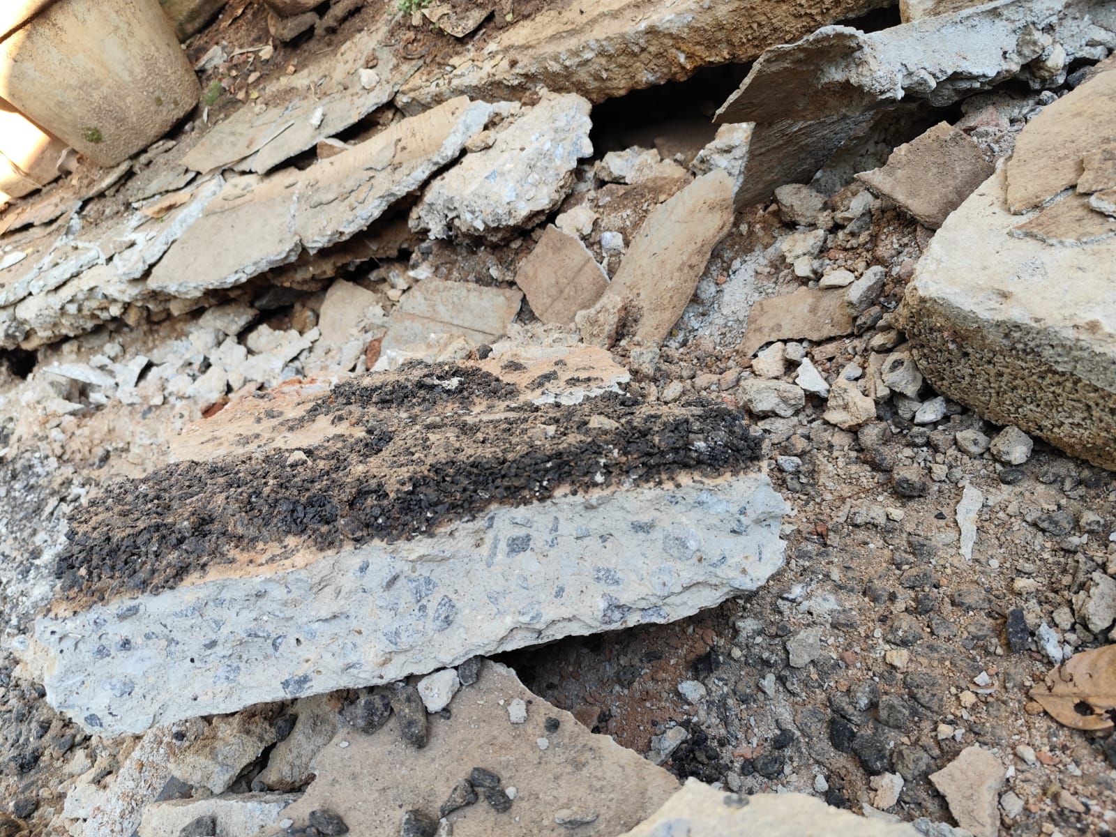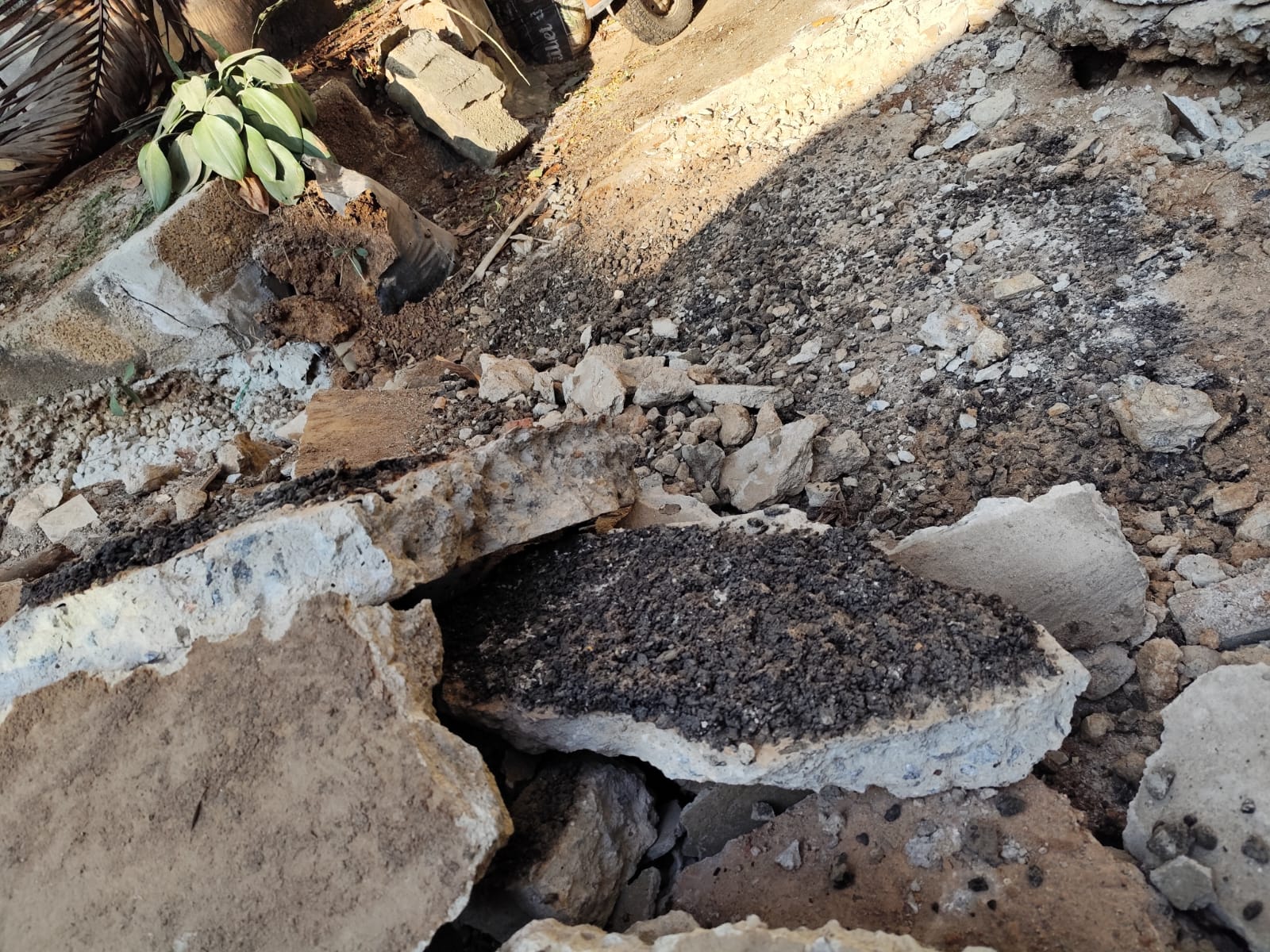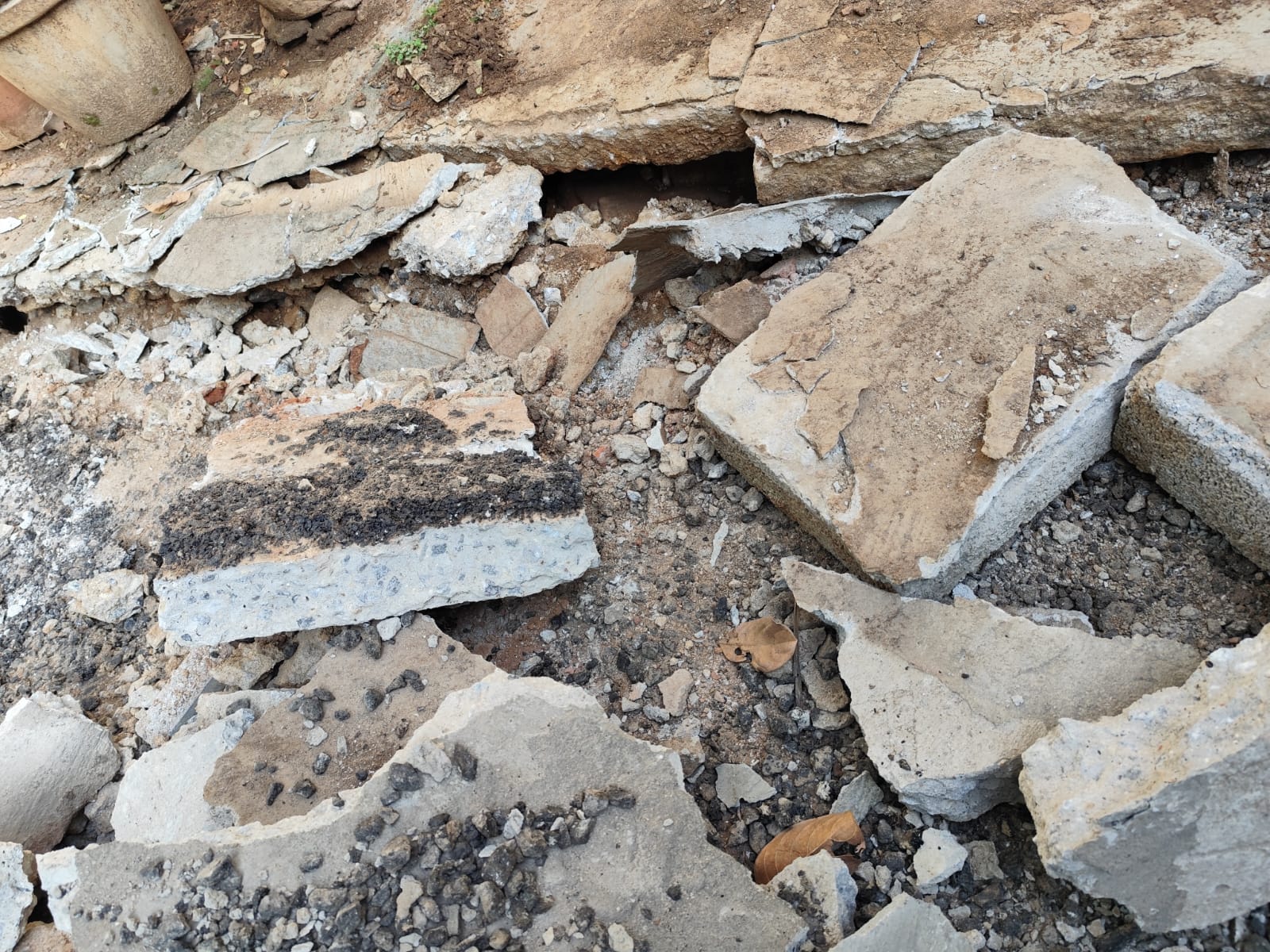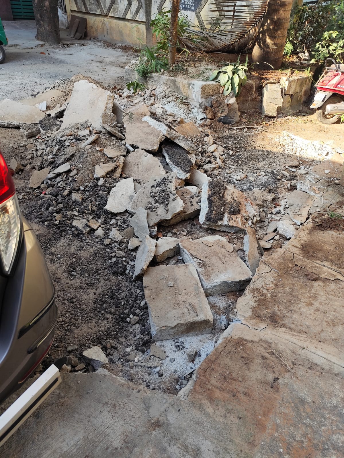 I am sharing photographs of the damaged 6-inch concrete slabs in front of my house, which were removed citing road tarring work. As my house is located at the dead end of the road, I am concerned that the gaps created between the drain slabs after removing the concrete packing may not be properly refilled. This removal appeared unnecessary and has resulted in safety concerns.