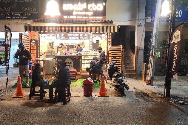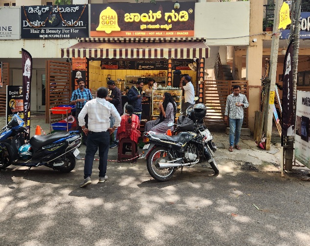 Chai Gudi shop illegally operating without trade and food license and repeated warnings about footpath encroachment not removed obstruction for public walking and vehicle movements.