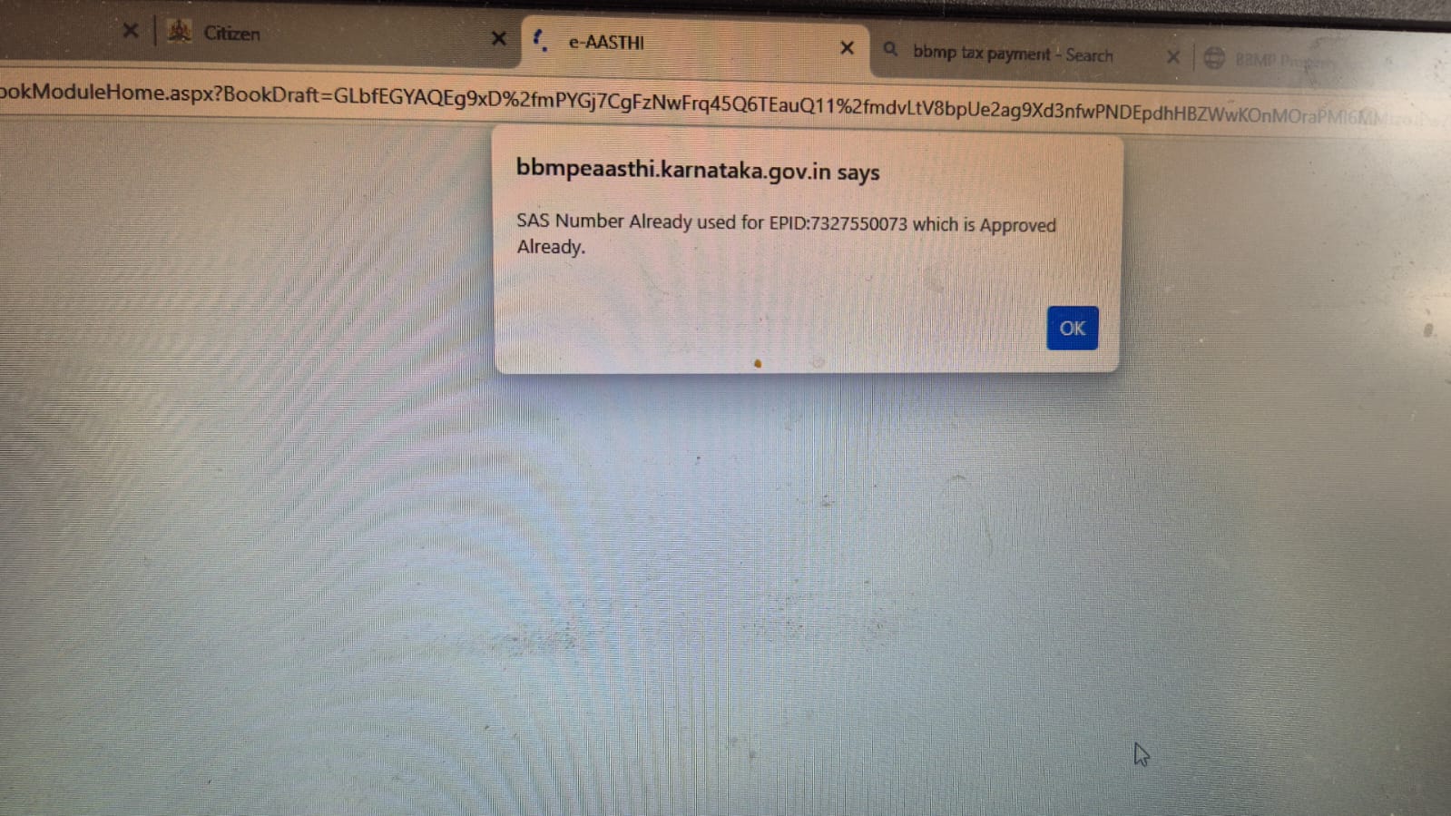 Today, I started applying for eKhatha application and the system stating that SAS number 8000014986 (which is pertaining to our property) already used for EPID 7327550073 which is approved already.