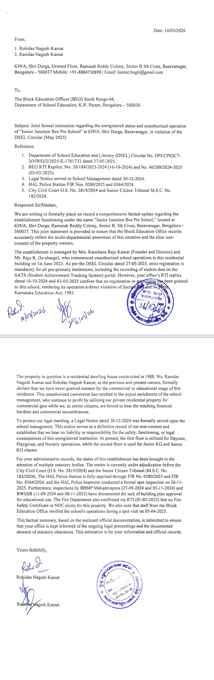 I wish to bring to your attention that a preschool operating under the name Junior Junction Bee Preschool has been functioning in a residential building since 1st June 2023 without obtaining the requisite trade license and approvals from BBMP. The establishment of such a commercial activity in a residential premises, without due authorization, raises serious concerns regarding compliance with municipal regulations and zoning norms. It is further submitted that this matter has already been brought to the notice of the Hon’ble City Civil Court, and the issue is presently under adjudication in O.S. No. 2819/2024. In view of the above, I request BBMP to take appropriate action in accordance with law and ensure that necessary regulatory compliance is enforced.